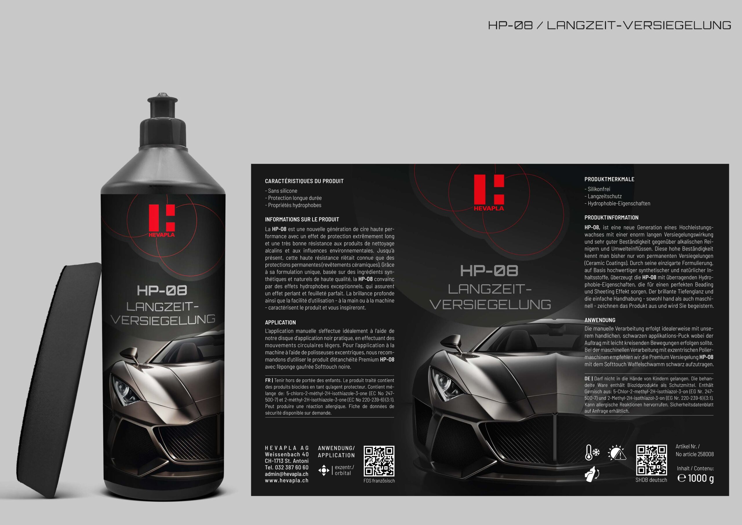 HP-08 versiegelt dabei nicht nur lackierte Fahrzeuglacke nachhaltig, sondern auch problemlos unlackierte Kunststoff-Partien. Weisse, unschöne Flecken nach dem Polieren auf angrenzenden Kunststoffteilen gehören somit der Vergangenheit an. Durch ihre einzigarte Formulierung, auf Basis hochwertiger, natürlicher und synthetischer Inhaltsstoffe sowie moderner Polymere, überzeugt HP-08 mit überragenden Glanz-Eigenschaften und einem bisher nie zuvor erreichten Wasser-Abperleffekt (Beading).