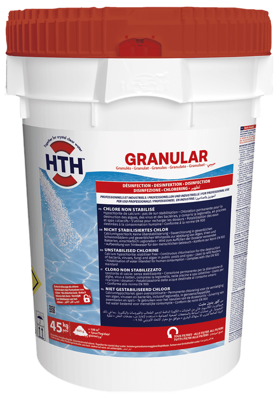 Calciumhypochlorit. Keine Überstabilisierung. Dauerchlorung zur Zerstörung von Bakterien, Viren, Pilzen und Algen in Schwimmbädern.